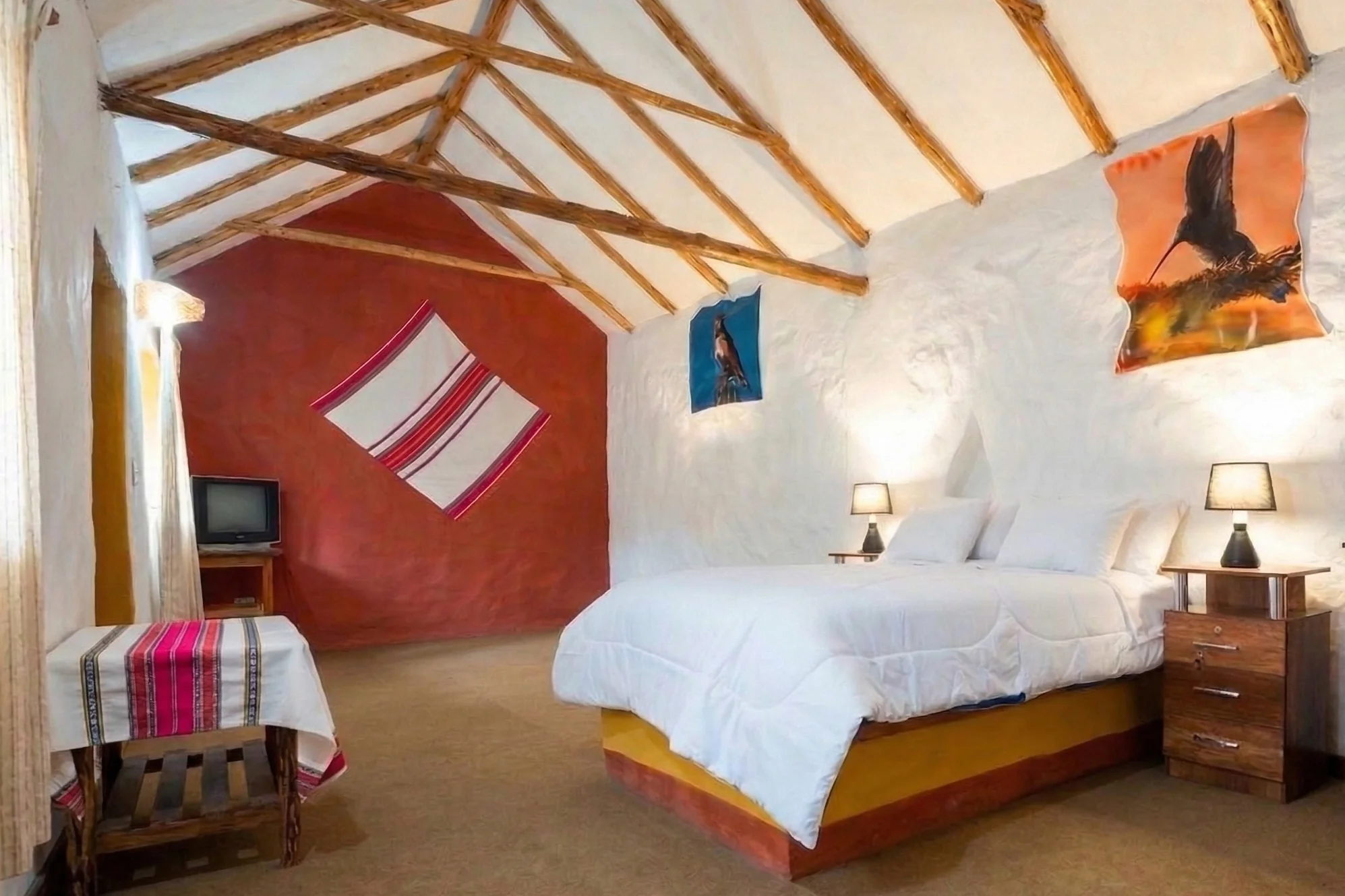Nuestra habitación matrimonial es una invitación a detener el tiempo. Diseñada como un santuario de descanso para dos, este espacio combina la solidez histórica de nuestros muros de piedra con la delicadeza de los textiles andinos. Despierta en la serenidad de Yanque, rodeado de detalles rústico-elegantes y el suave aroma de las flores nativas de nuestro jardín. Aquí, la calidez no proviene solo de nuestra calefacción eco-amigable, sino de la historia que habita en cada rincón de esta casona centenaria